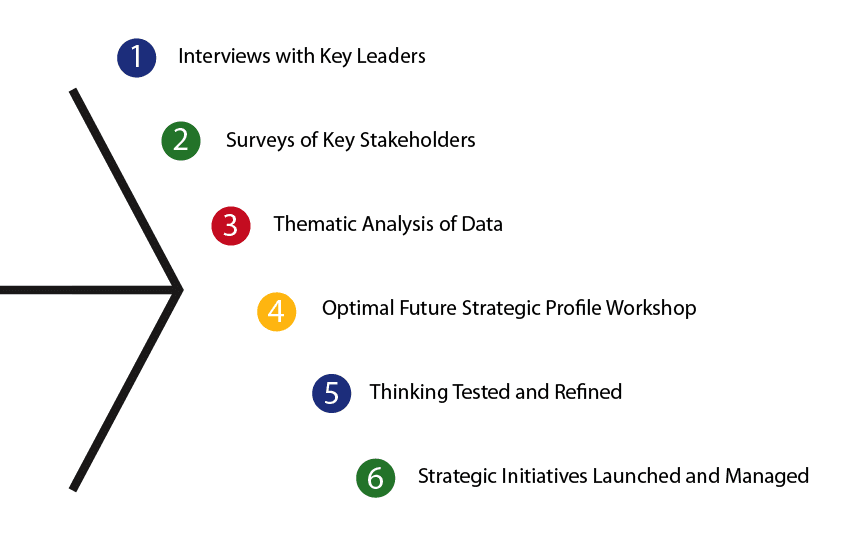 2. SURVEY OF KEY STAKEHOLDERS These surveys are circulated to the leadership team and an agreed larger constituency to gain a full understanding of the range of perspectives and insights that exist. The key here is to both know and consider these perspectives AND to send the message that those who will be responsible for the changes to come have influenced the direction of the organization. This step significantly accelerates the successful implementation of the new direction and priorities.